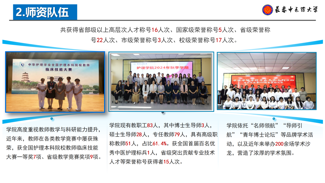 学院高度重视教师教学与科研能力提升,坚持“以师育师、以研促教”,构建了系统化的师资培养体系。近年来,教师在各类教学竞赛中屡获殊荣,获全国护理本科院校教师临床技能大赛一等奖7项、省级教学竞赛奖项9项。