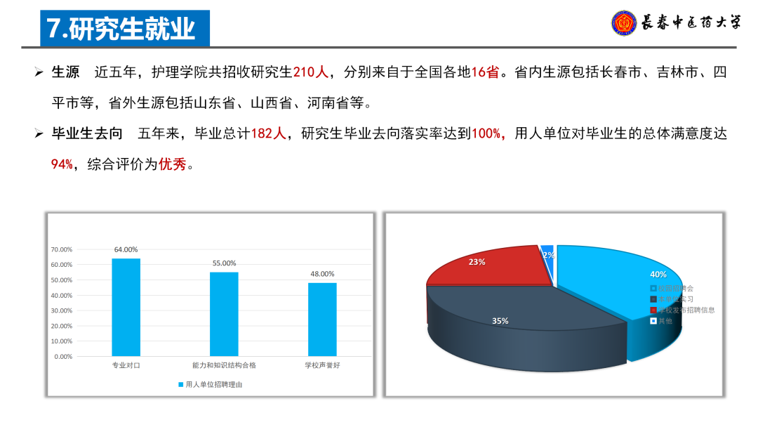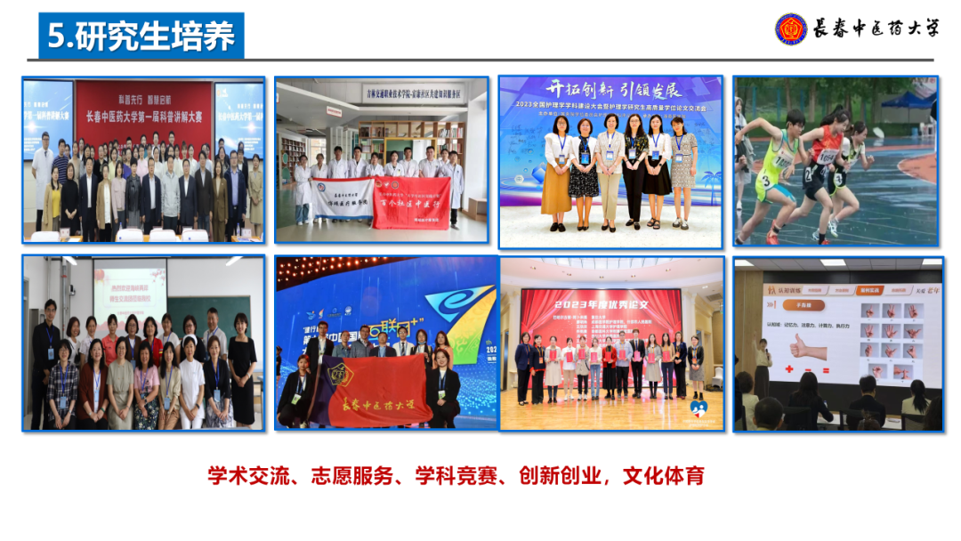 学院积极搭建学生能力展示与提升平台。近五年,研究生参与中华护理学会学术会议等百余场学术活动,20余人次进行论坛发言或壁报展示;以第一作者发表SCI、北大核心等论文200余篇,40余篇论文获会议奖项;在“互联网+”“挑战杯”等竞赛中获国家级一等奖4项、二等奖3项及多项省级奖项;连续三年获学校研究生授课技能大赛一等奖;组织开展社区义诊等志愿服务超百次。研究生中获得全国高校节能志愿者、全国高校大学生急救知识科普志愿活动“青年之星”、吉林省大学生自强之星、长春市百优大学生等多项荣誉。