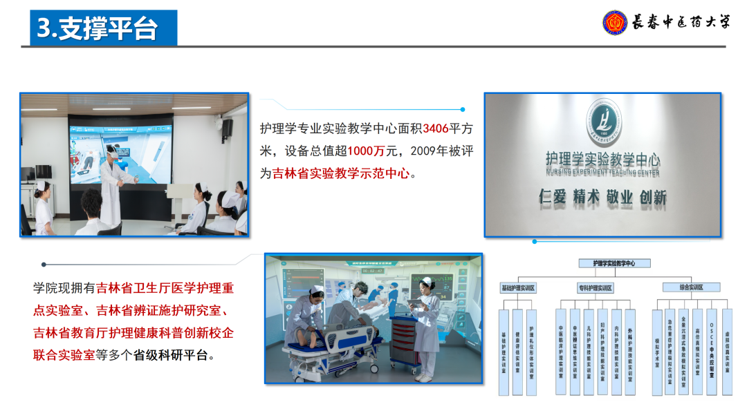 护理学专业实验教学中心面积3406平方米,设备总值超1000万元,涵盖护理实训区、模拟医院、虚拟仿真实验教学平台三大功能区,2009年被评为吉林省实验教学示范中心。