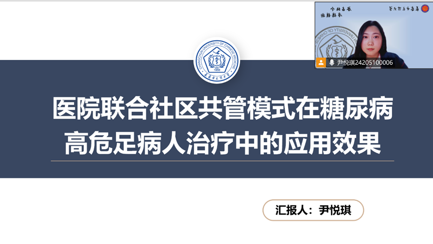 尹悦琪以《医院联合社区共管模式在糖尿病高危足病人治疗中的应用效果》为主题,详细阐述医联体设立虚拟病房管理中心,通过整合资源、综合管理高危患者可有效降低患者再入院率。