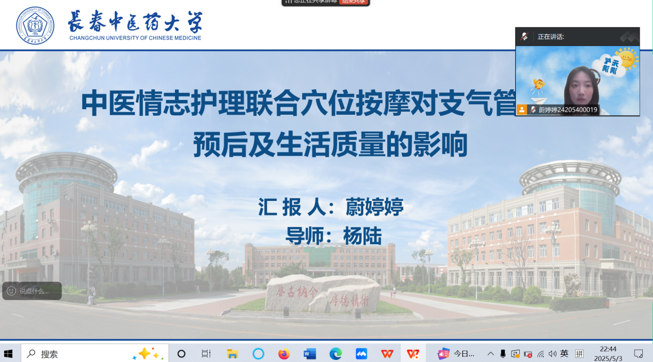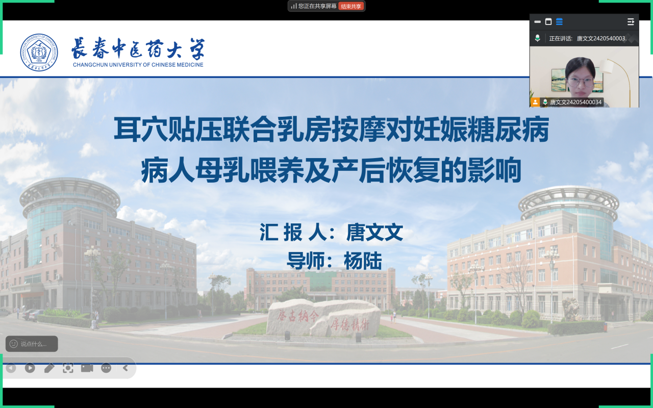 此次活动分享人是2024级的护理研究生蔚婷婷同学和唐文文同学,分享主题为中医护理联合干预的护理实践。