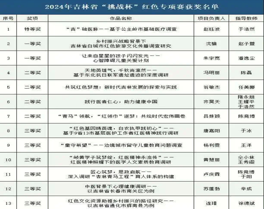 近日,由共青团吉林省委、吉林省教育厅、吉林省科学技术协会等单位联合主办的2024年吉林省“挑战杯”红色专项赛圆满落幕。必赢线路检测3003no1的项目《乡村振兴战略背景下吉林省白城市红色旅游文化传播调查研究》和《让来自星星的孩子闪闪发光—心智障碍儿童关爱计划》获得省级一等奖,《"童守希望"—边境城市留守儿童教育问题调查》获得省级三等奖。